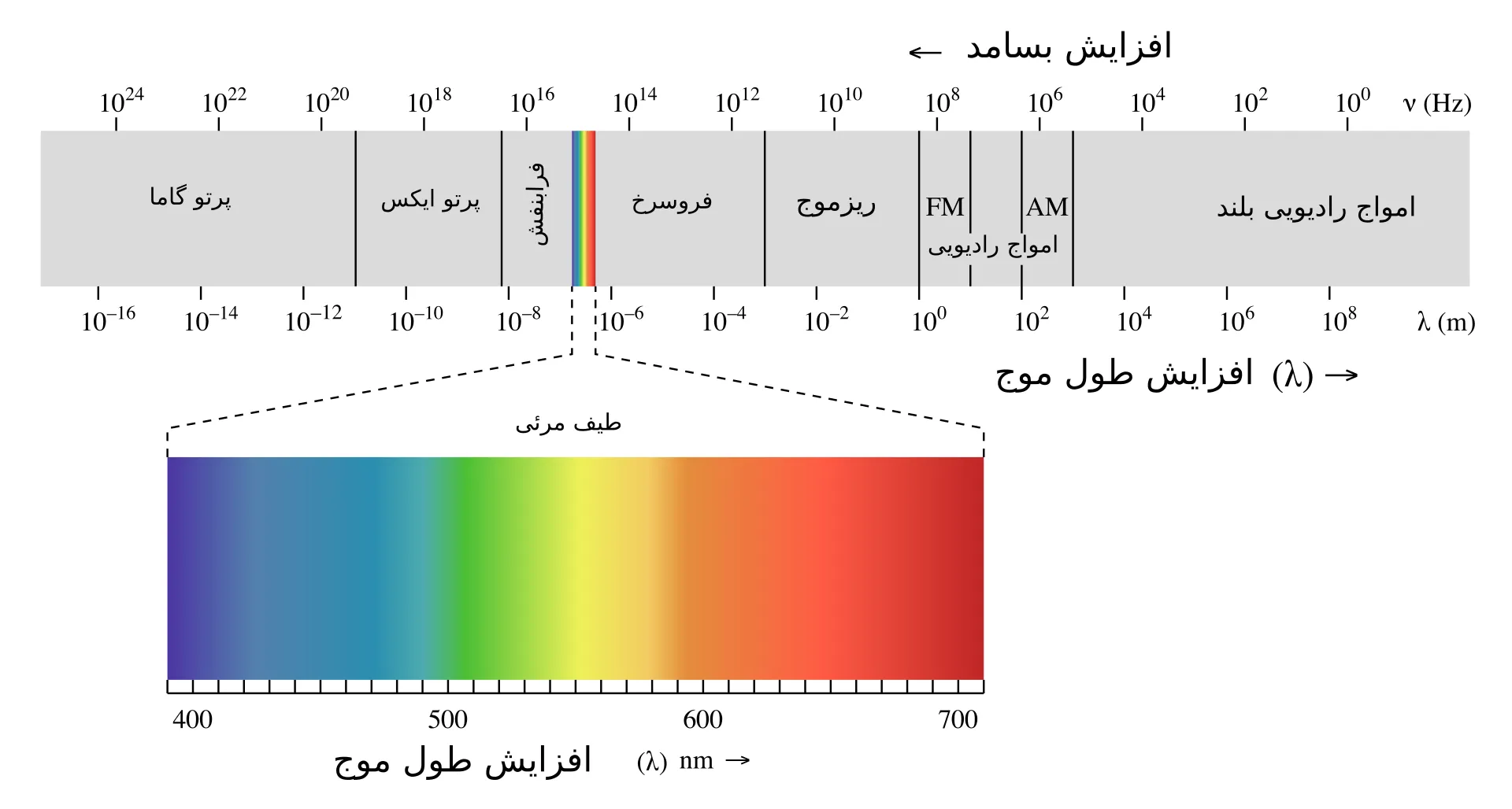 بخش بسیار کوچکی از تابش الکترومغناطیسی برای چشم انسان قابل مشاهده و برای مغز قابل درک است. تنها آن بخش از طیف الکترومغناطیسی که از قرنیه عبور کرده و توسط شبکیه جذب می شود، به صورت نور و رنگ درک می گردد. طول موج های طیف مرئی معمولاً بر حسب نانومتر (nm) ــ معادل یک میلیاردم متر ــ بیان می شوند و در بازه ای بین ۴۰۰ تا ۷۰۰ نانومتر قرار دارند؛ نور قرمز در انتهای بلندتر و نور بنفش در انتهای کوتاه تر طیف واقع است.